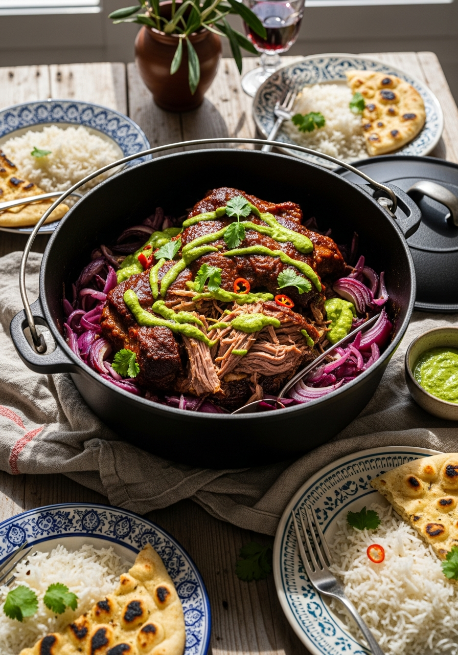 Ce plat d’agneau confit célèbre la magie des cuissons lentes et des épices douces. La viande devient fondante, presque effilochée à la cuillère, imprégnée d’un mélange parfumé de yaourt, d’ail et de garam masala. Les oignons caramélisés apportent une profondeur sucrée, tandis que le chutney de coriandre réveille l’ensemble avec une note fraîche et acidulée.