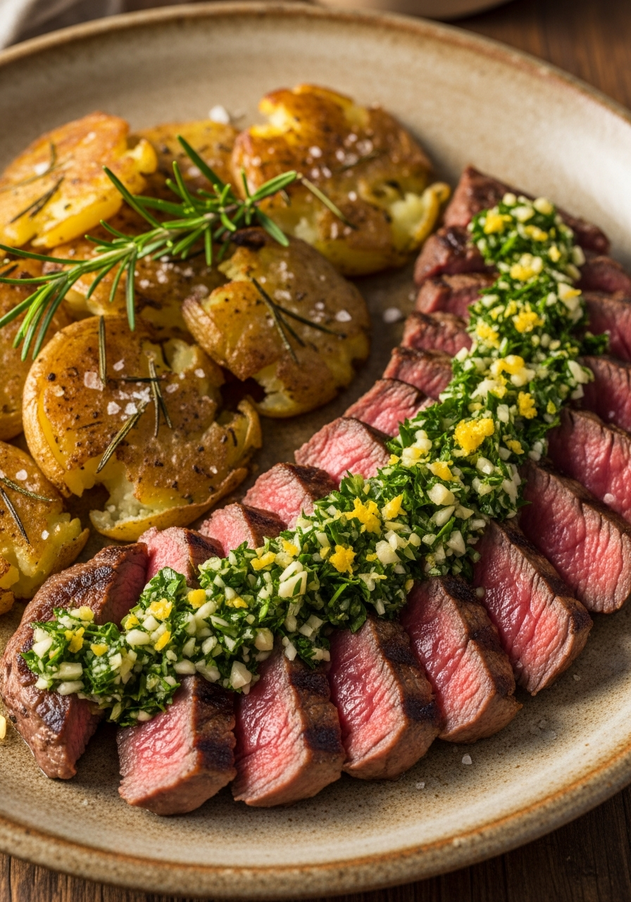 Une pièce de bœuf bien saisie, une gremolata chaude aux parfums d’ail et de citron, et des pommes de terre croustillantes au romarin : cette assiette est un hommage aux grillades méditerranéennes, simples mais intensément savoureuses.