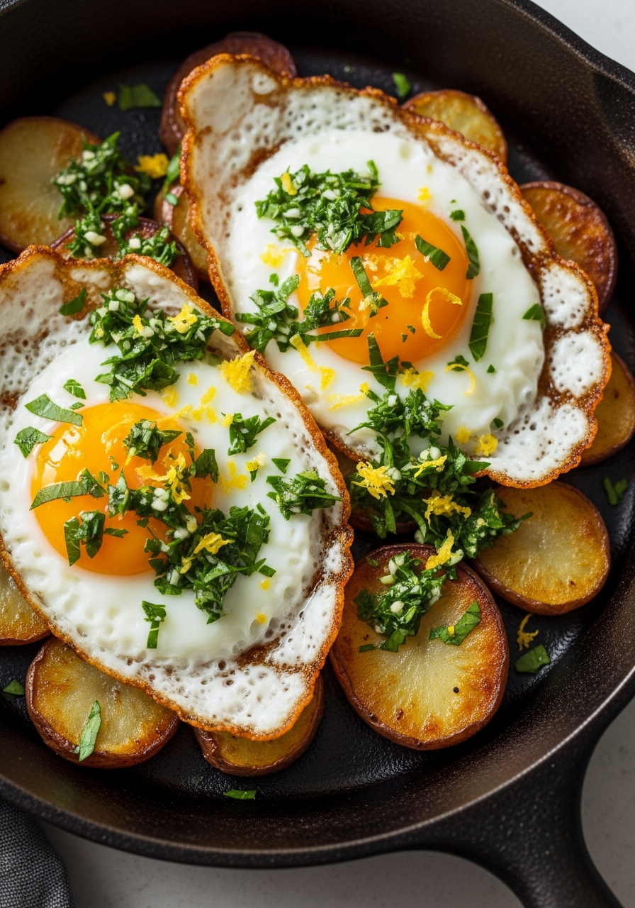 Quand les œufs au plat deviennent croustillants sur les bords et reposent sur un lit de pommes de terre dorées et fumées, le résultat est irrésistible. Cette recette simple met en valeur des ingrédients du quotidien, réveillés par une gremolata fraîche au persil et au citron qui apporte éclat et équilibre.