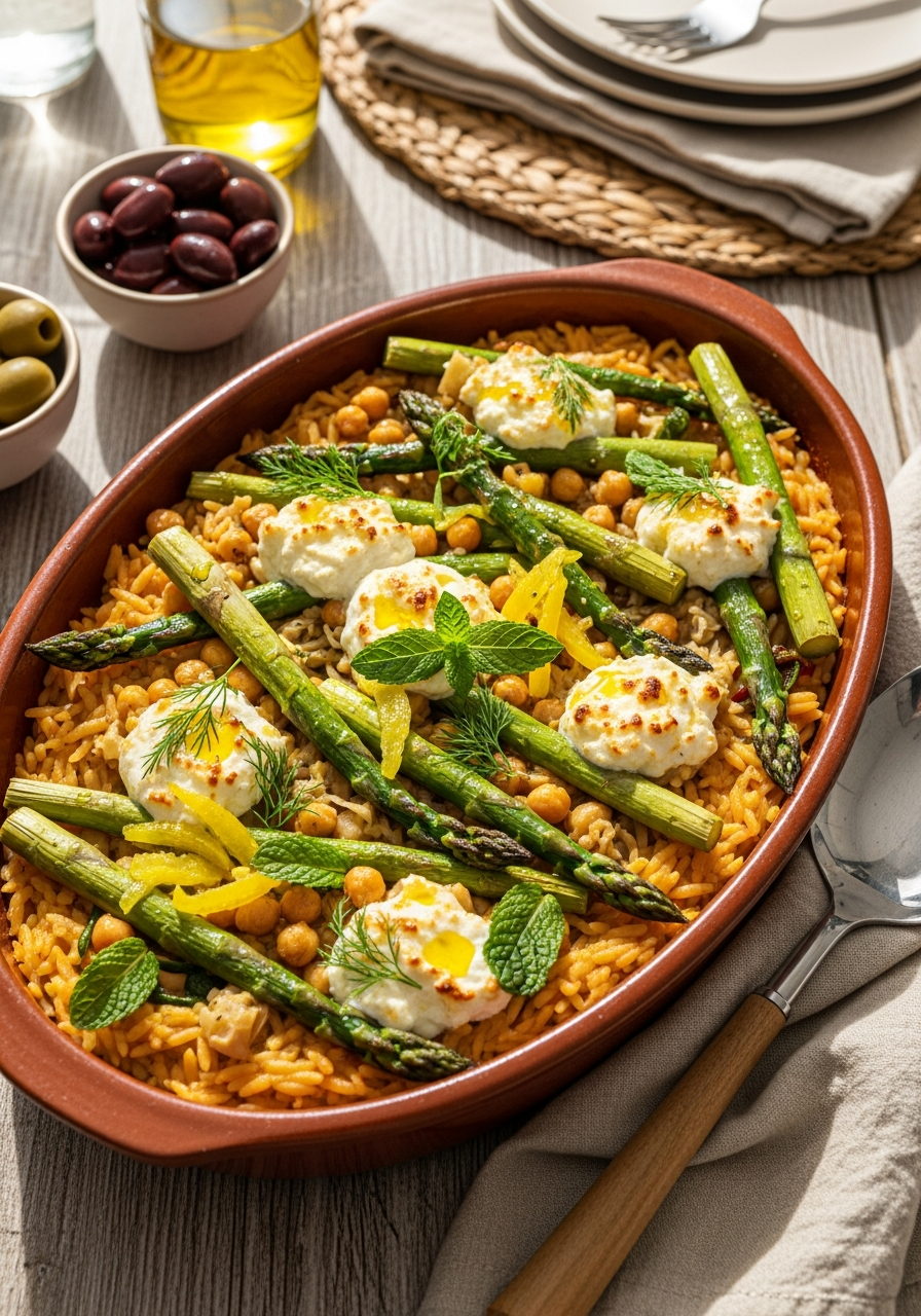 Ce plat au four célèbre le printemps avec une palette de saveurs vives et contrastées. L’orzo s’imprègne d’un bouillon parfumé aux épices chaudes, tandis que les asperges rôtissent doucement à la surface. Le citron confit apporte une profondeur saline et acidulée, adoucie par une feta fouettée au yaourt et aux herbes fraîches. Un plat convivial, à la fois réconfortant et lumineux.