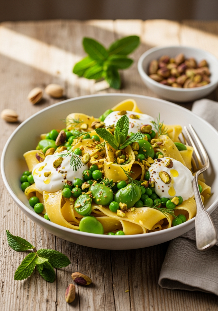 Ces pappardelle printanières célèbrent les premiers légumes verts de la saison dans une assiette lumineuse et parfumée. Les fèves et petits pois apportent douceur et fraîcheur, tandis qu’un yaourt citronné au cumin vient enrober le tout d’une touche crémeuse et épicée. Les herbes fraîches et les pistaches ajoutent contraste et relief pour un plat végétarien généreux, à la fois simple et vibrant.