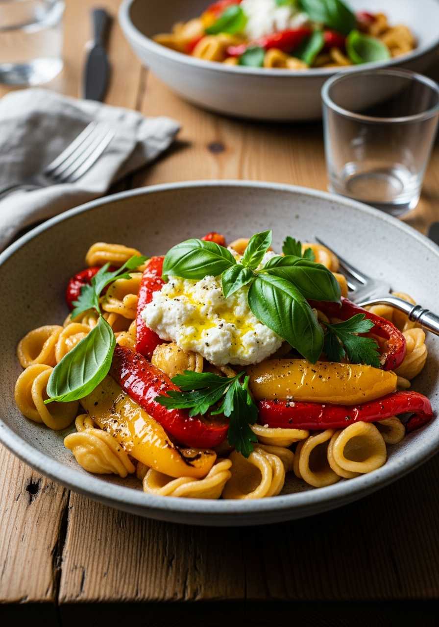 Cette assiette de pâtes célèbre le printemps avec des poivrons doucement rôtis, une ricotta fraîche et des herbes du jardin. Inspirée d’une approche simple et respectueuse des produits, cette recette met en valeur la douceur naturelle des légumes et la qualité d’une bonne huile d’olive.