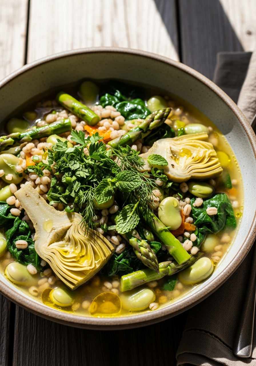 Ce ragoût printanier célèbre les premiers légumes tendres et verts de la saison. L’orge perlé apporte une texture délicatement nacrée, tandis que les fèves, les artichauts et le citron confit créent un équilibre entre douceur, fraîcheur et notes salines. Un plat végétarien complet, chaleureux sans être lourd, parfait pour les soirées encore fraîches du printemps.