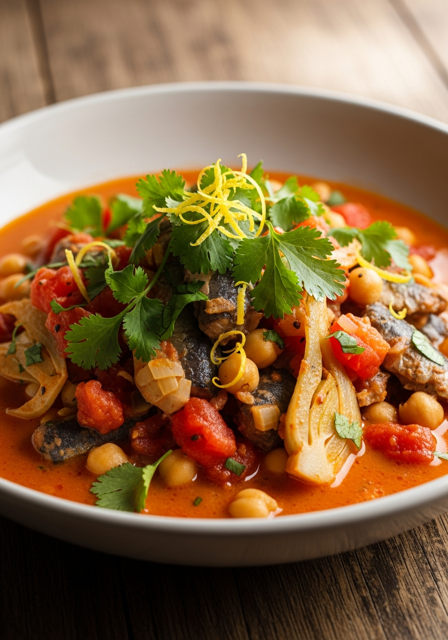 Ce ragoût printanier marie la fraîcheur anisée du fenouil, la douceur des pois chiches et la richesse des sardines dans une sauce parfumée aux épices douces et au lait de coco. Inspiré par une approche végétale et épicée chère à Meera Sodha, ce plat célèbre les produits méditerranéens en les enveloppant de chaleur et de lumière.
