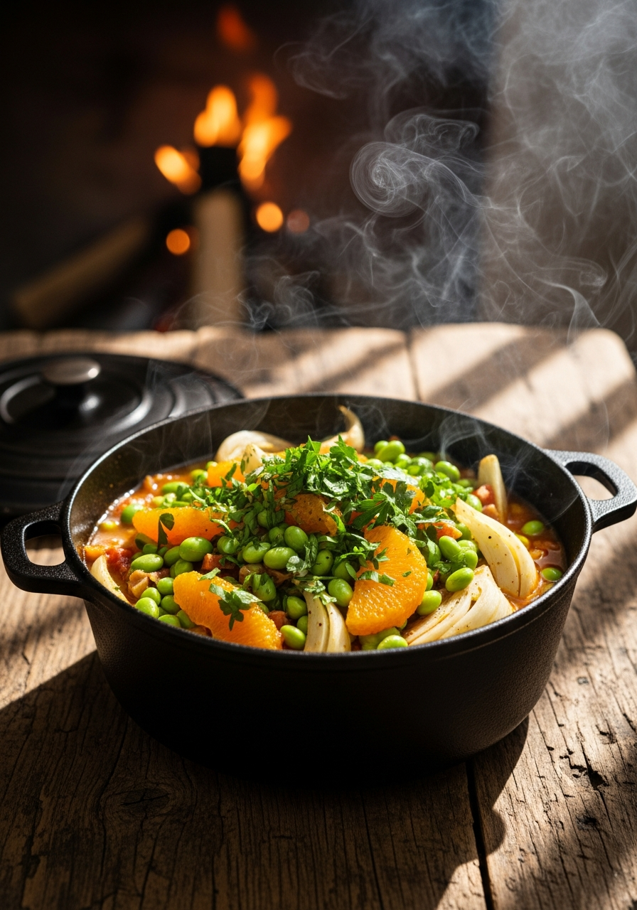 Ce ragoût printanier célèbre la rencontre entre la terre et le feu. L’edamame, tendre et nourrissant, s’unit au fenouil braisé et à la fraîcheur éclatante des agrumes dans une préparation mijotée à l’esprit rustique. Les notes fumées, les zestes d’agrumes et l’huile d’olive généreuse évoquent une cuisine simple, directe et intensément parfumée.