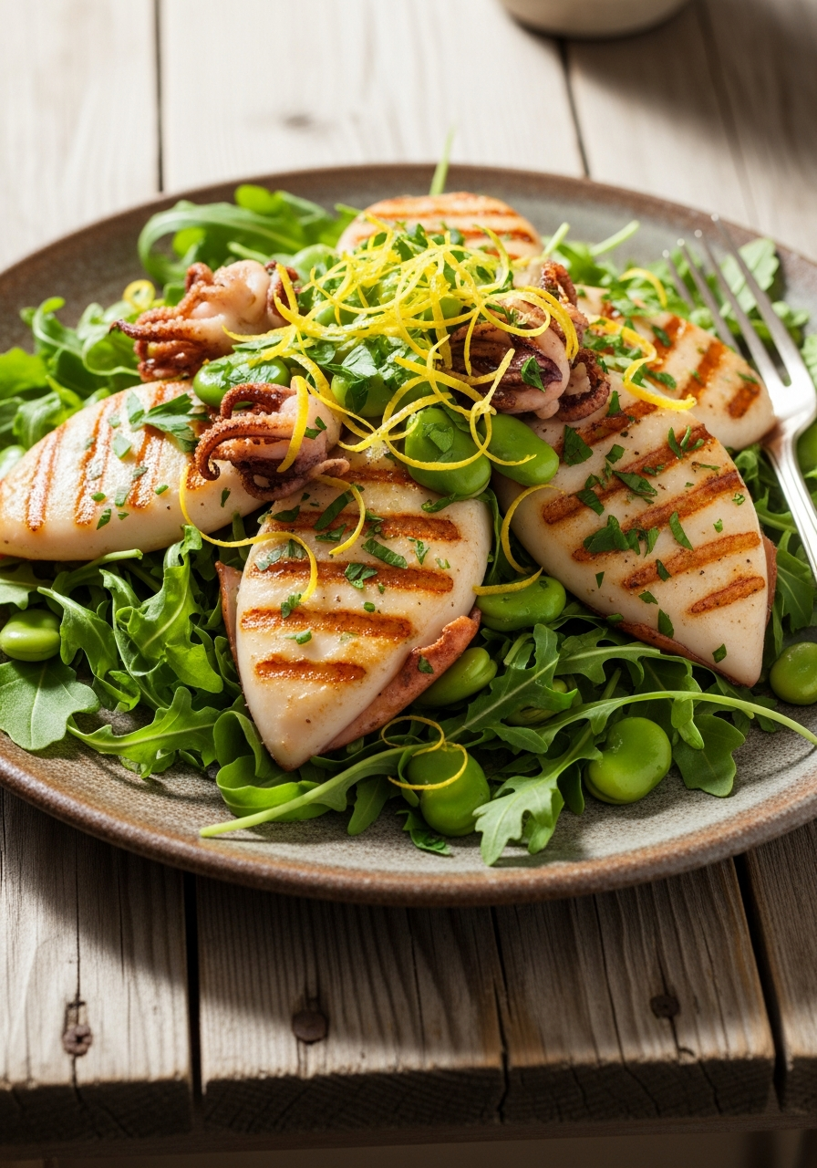 Cette salade tiède célèbre la simplicité du printemps méditerranéen : des calamars fraîchement grillés, des fèves croquantes et la fraîcheur aromatique du citron. Inspirée d’une approche locavore et respectueuse des saisons, elle met en valeur des produits peu transformés, cuisinés avec précision et délicatesse.