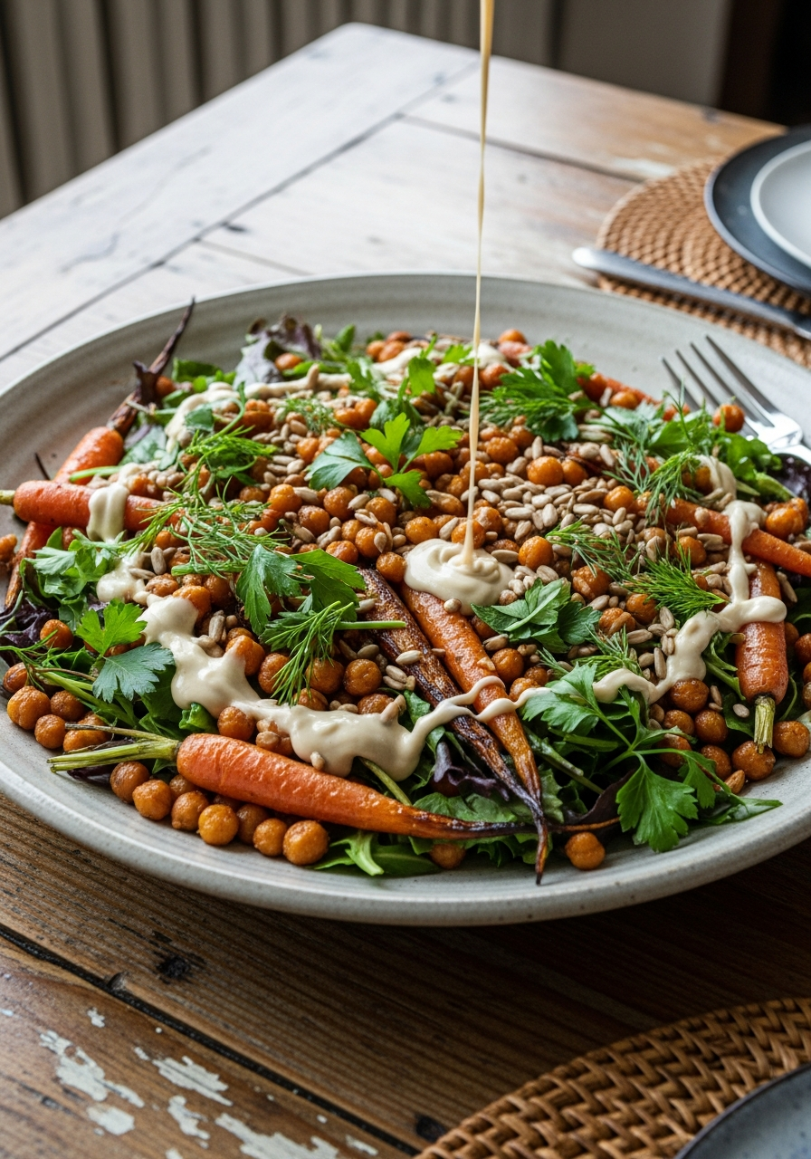 Salade tiède de carottes nouvelles rôties, pois chiches croustillants et sauce tahini-citron