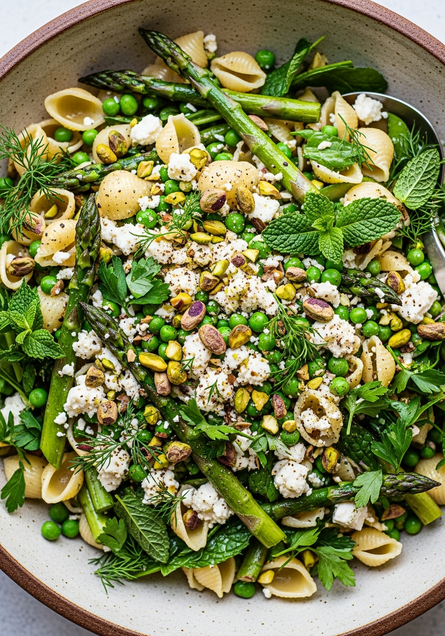 Salade tiède de coquillettes printanières, asperges rôties et feta au citron confit