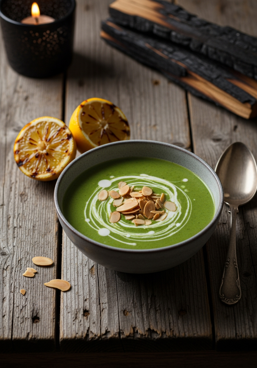 Cette soupe de printemps célèbre la puissance du feu et la simplicité des beaux produits. Les épinards sont saisis à feu vif pour révéler leur caractère, les poireaux rôtis apportent une douceur caramélisée et le citron brûlé insuffle une tension acidulée et légèrement fumée. Un plat vibrant, à la fois rustique et lumineux.