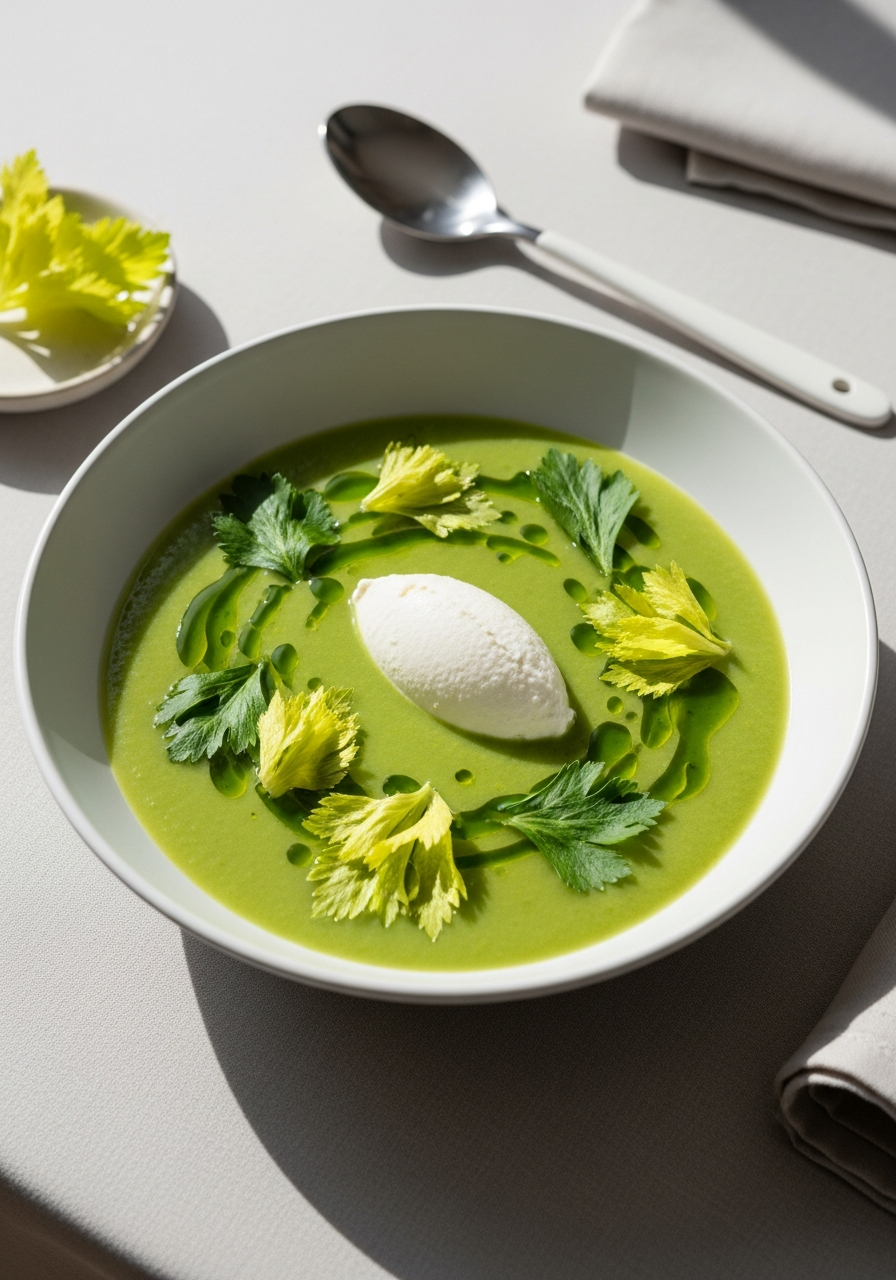 Cette soupe célèbre le céleri branche comme un ingrédient noble du printemps. Inspirée par une approche contemporaine et émotionnelle à la Massimo Bottura, elle joue sur les textures et les contrastes : douceur végétale, fraîcheur citronnée, onctuosité lactée et une huile verte intense qui vient dessiner l’assiette. Une entrée délicate ou un plat léger, entre tradition italienne et expression moderne.