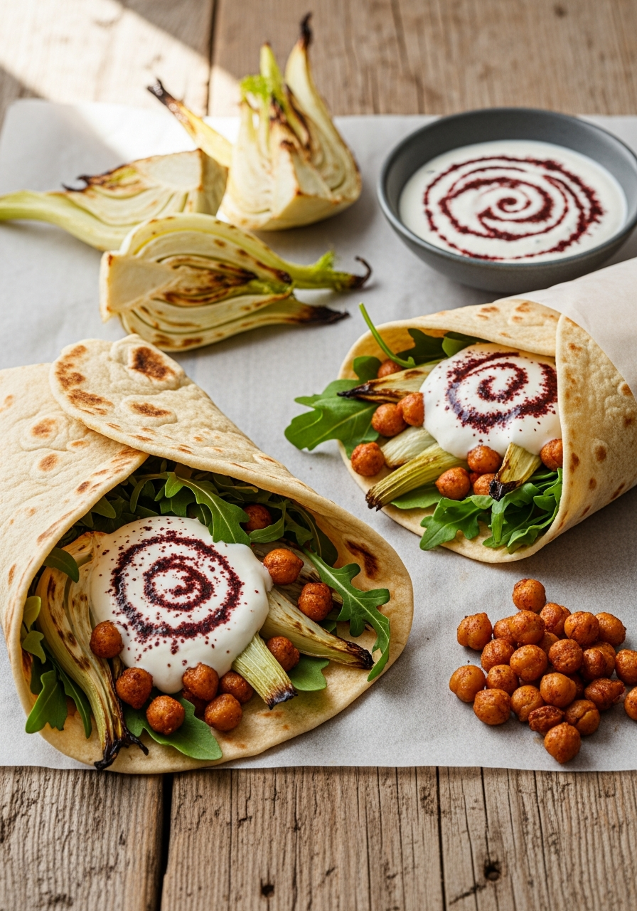 Ces wraps printaniers célèbrent le fenouil rôti, dont la douceur anisée se transforme au four en une tendresse presque confite. Associé à des pois chiches croustillants et à un yaourt acidulé au sumac, le tout enveloppé dans un pain chaud, ce plat offre un équilibre de textures et d’épices, dans un esprit méditerranéen aux accents moyen-orientaux.