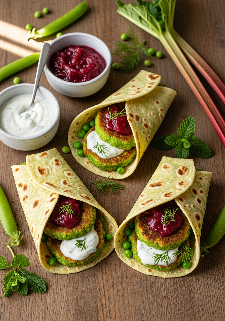 Ces wraps printaniers jouent sur les contrastes chers aux cuisines métissées : la douceur herbacée des petits pois rencontre des épices chaudes, un chutney acidulé de rhubarbe et la fraîcheur d’un yaourt citronné. Un plat végétarien généreux et vibrant, parfait pour un déjeuner ensoleillé.